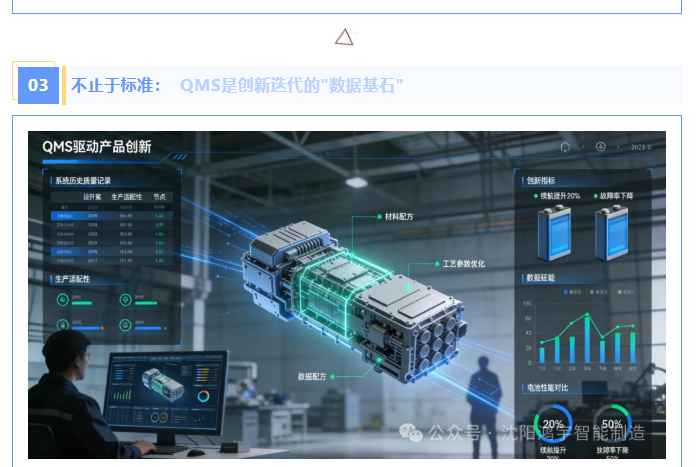 某新能源企业利用QMS积累的电池生产质量数据,分析不同材料配方、工艺参数与电池续航、安全性的关联关系,成功研发出续航提升20% 的新一代产品,同时将产品故障率下降50%。可见,QMS不仅是质量管控工具,更是连接研发、生产、市场的"创新桥梁",让产品迭代和工艺升级有迹可循、有据可依。