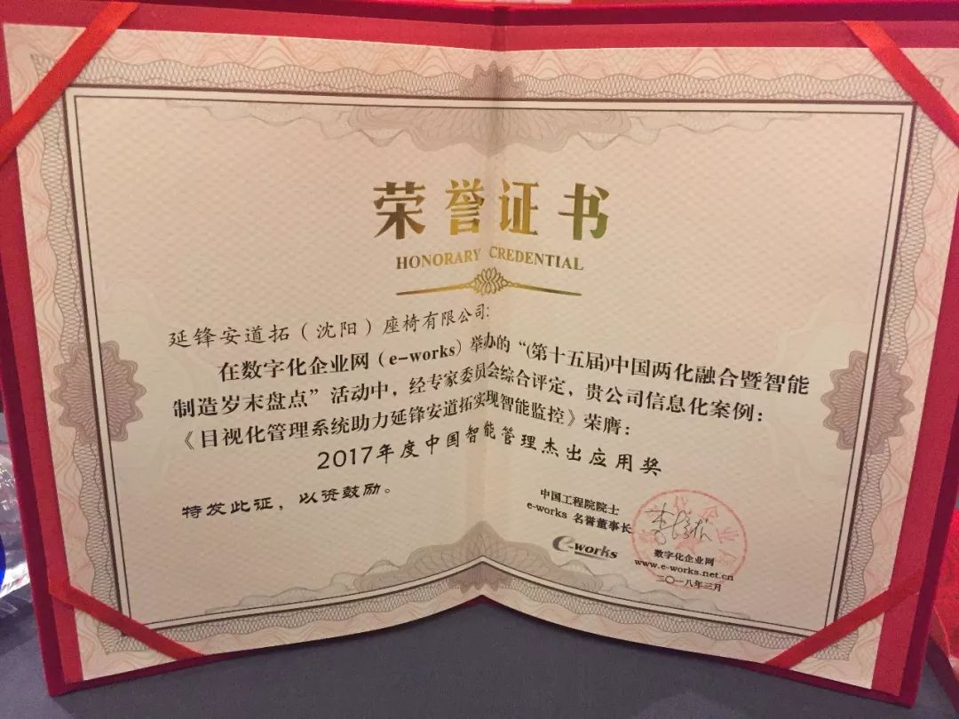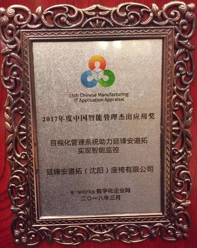 延锋安道拓凭借沈阳鸿宇科技自主研发的目视化系统荣获“2017年度中国智能管理杰出应用奖”