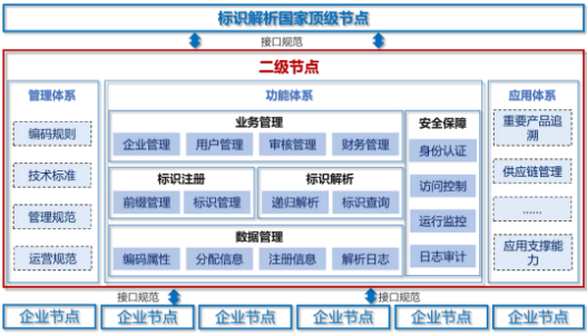 ●功能体系:主要从信息系统建设的角度,在具备基础设施的前提下,界定二级节点应提供的核心系统功能,包括标识注册、标识解析、业务管理、数据管理、安全保障等。