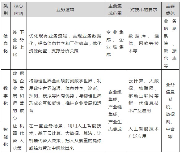 以下从核心内涵、业务逻辑、主要集成范围、对技术的要求和主要载体等方面,对信息化、数字化和智能化进行初步比较分析。