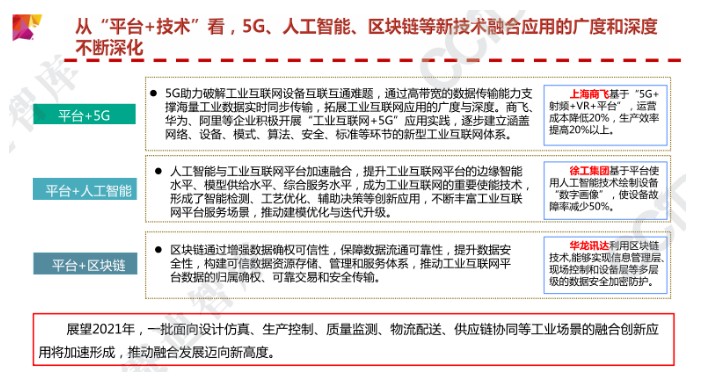 2020年,围绕“平台+新技术”的融合创新发展取得快速的发展,各企业积极探索在不同工业场景中深化5G、人工智能、区块链等新技术和工业互联平台的融合应用,涌现出一批典型应用场景。一是商飞、华为、阿里等企业积极开展“工业互联网+5G”应用实践,逐步建立涵盖网络、设备、模式、算法、安全、标准等环节的新型工业互联网体系。二是人工智能与工业互联网平台融合加速,形成了智能检测、工艺优化、辅助决策等创新应用,推动建模优化与迭代升级,增强工业互联网平台解决实际问题的能力。三是区块链助力平台构建可信数据资源存储、管理和服务体系,推动平台数据的归属确权、安全传输和可靠交易。