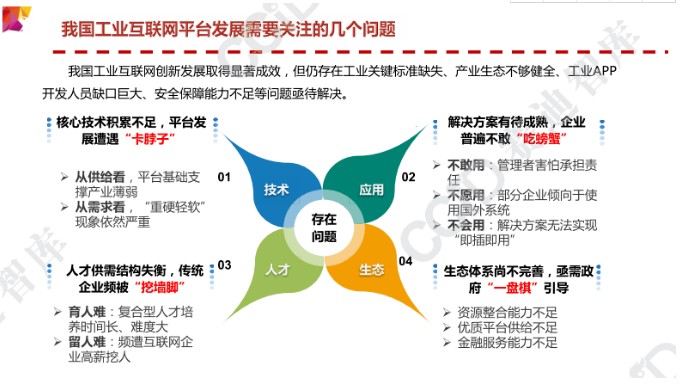 第一,资源整合能力不足。国内缺少类似西门子、GE等能提供整体解决方案的产业巨头,平台企业存在“各自为战”的现象,资源共享和整合能力不够。第二,优质平台供给不足。我国制造企业的行业机理、工艺流程、模型方法等工业知识积累较薄弱,存在低层次平台重复扎堆的现象。第三,金融服务能力不足。平台建设投入大、回报周期长,资本市场目前对平台的支持力度有待进一步提高,大量平台企业初期无法获得足够充足恒定的资本投入。