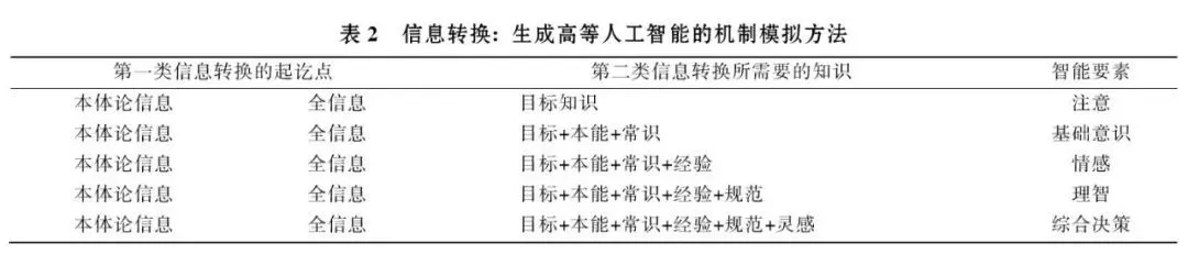 研究发现,高等人工智能的所有要素——注意能力、基础意识能力、情感能力、理智能力和综合决策能力的生成机制, 分别是在外来刺激所呈现的信息 (称为“本体论信息”)的激励下启动、在各自的知识支持下展开、在各自目标的导控下完成的信息转换: 包括第一类信息转换(由本体论信息到全信息的转换) 和第二类信息转换(包括由全信息到注意能力的转换、全信息到基础意识能力的转换、全信息到情感能力的转换、全信息到理智能力的转换以及到综合决策能力的转换), 这样, 就完成了高等人工智能原理的基本建构. 这些信息转换的情形, 如表 2 所示.