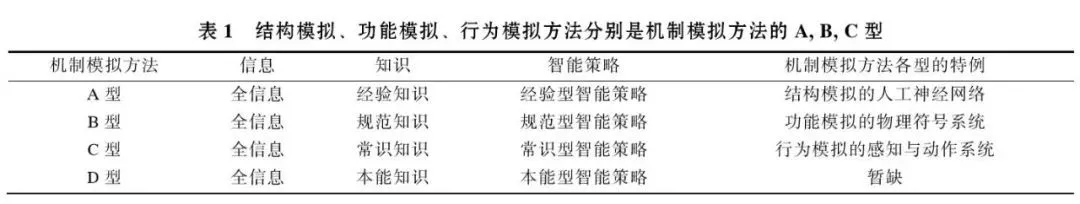不仅如此, 表 1 还进一步表明, 现有人工智能三大主流方法——基于结构模拟的人工神经网络研究、基于功能模拟的物理符号系统研究、基于行为模拟的感知-动作系统研究——分别是机制模拟方法在各自相应知识条件下的特例.