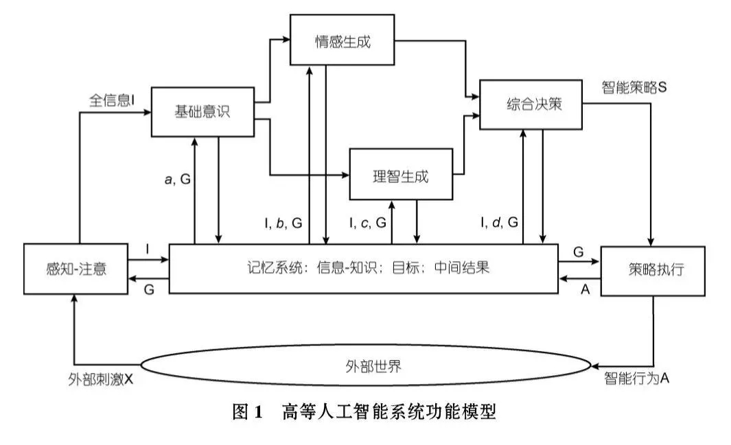 于是, 经过深入研究我们提出了“以基础意识、情感、理智3位一体为特征的高等人工智能理念”和相应的高等人工智能系统功能模型, 后者如图 1 所示.