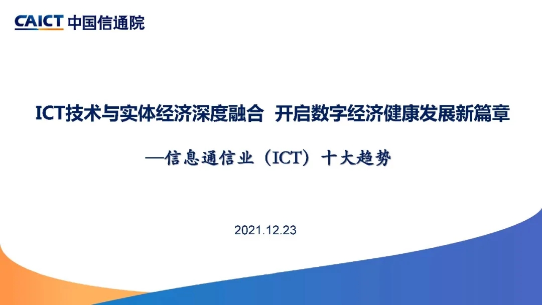 2021年12月23日,中国信息通信研究院(以下简称“中国信通院”)主办的2022 中国信通院ICT+深度观察报告会-主论坛在京举办,中国信通院副院长王志勤发布了信息通信业(ICT)十大趋势。