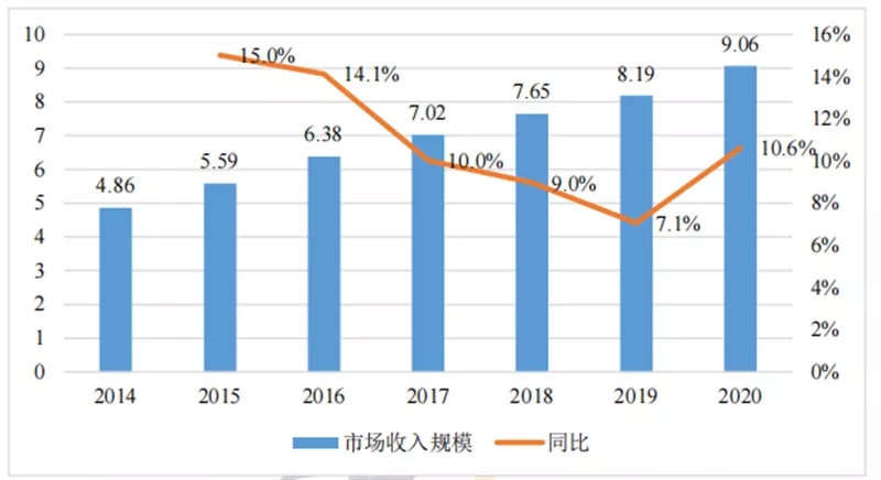 量子通信也受到中国政府的高度重视。2020 年 10 月 16 日,中共中央政治局就量子科技研究和应用前景举行第二十四次集体学习,推动中国量子科技发展的战略谋划和前瞻布局。在政策、市场推动下,我国量子通信行业也快速增长,市场规模从 2014 年的 4.86 亿元增长至 2018 年的 7.65 亿元,复合年增长率为 12.01%;2019 年中国量子通信市场规模达到8.19 亿元,同比增长 7.06%;2020 年中国量子通信市场规模达到 9.06 亿元,同比增长 10.6%。