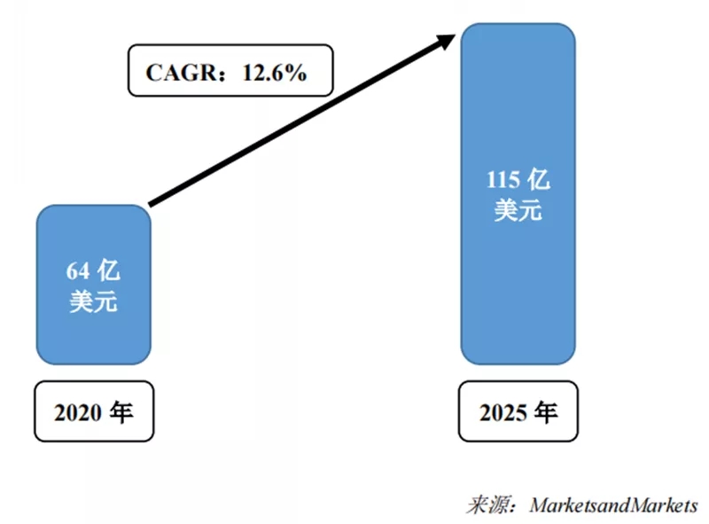 IoT Analytics 数据显示,全球物联网平台市场在 2015-2020 年间的复合年增长率达到惊人的 48%,市场规模达到 50 亿美元,远超 2016 年的 3 亿美元。根据 Markets and Markets 发布的报告显示,全球物联网云平台市场将从 2020 年的 64 亿美元增长到 2025 年的 115 亿美元,预测期内复合年增长率(CAGR)为 12.6%。