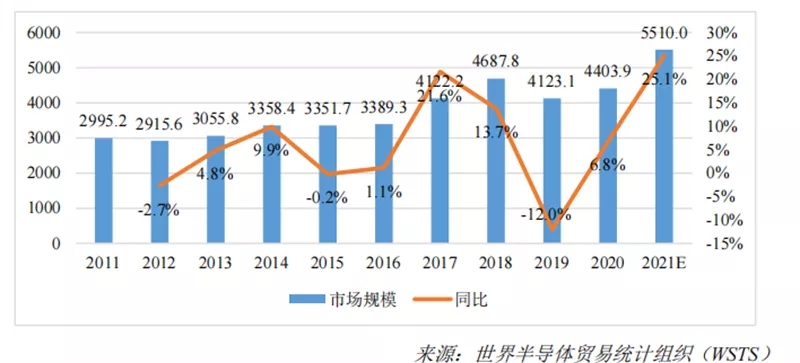 图片▲ 2011-2021 年全球半导体产业市场规模及预测