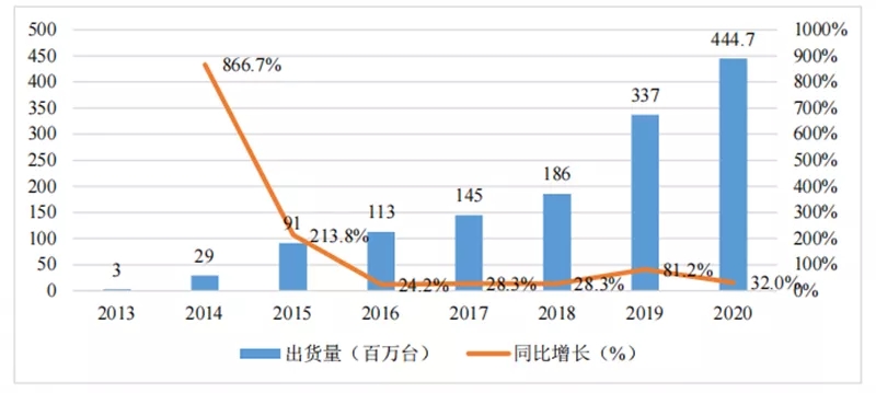 智能穿戴主要包括智能手环、手表、耳机等。根据 IDC 发布的《全球可穿戴设备季度跟踪报告》,2013-2020 年全球可穿戴设备出货量呈逐年上涨的趋势,起步增速较快,近年有所下滑。2019 年,全球可穿戴设备出货量为 3.37 亿部,较上年同比增长 81.2%,可穿戴设备市场扩张迅速。受疫情影响,2020 年的可穿戴设备出货量为 4.5 亿,较 2019 年大涨 32%。