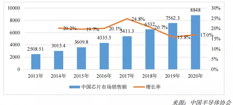 近年来,随着国内半导体行业投入增大,大量新兴企业快速成长,中国芯片市场发展迅猛。根据中国半导体协会数据,2013-2020 年,我国芯片市场规模不断增长,2019 年中国芯片销售额为 7562.3 亿元,同比增长 15.8%。截至 2020 年中国芯片销售额为 8848 亿元,较2019 年增加 17%。