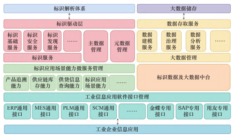 工业软件云平台由多个独立的微服务组成,每个微服务都有专属的业务逻辑和数据库,便于技术升级、应用灵活。云标识微服务通过集成来自边缘设备的标识数据,实现对设备消息的内容解析、过滤提取、重新整合;进而转发到后端服务,无缝连接云平台后端的存储组件、函数计算、大数据分析套件、工业软件应用,打破设备及工业软件之间的数据隔离。云标识微服务对海量工业标识进行统一解析,使用消息队列服务之上的 XML/JSON 等格式或者 RESTful Web 服务来实施风险管理、流程管理;将统计数据或必要信息传输到其他信息技术或操作技术系统,如 PLM、ERP、MES、SCM、仓储管理系统(WMS)等。