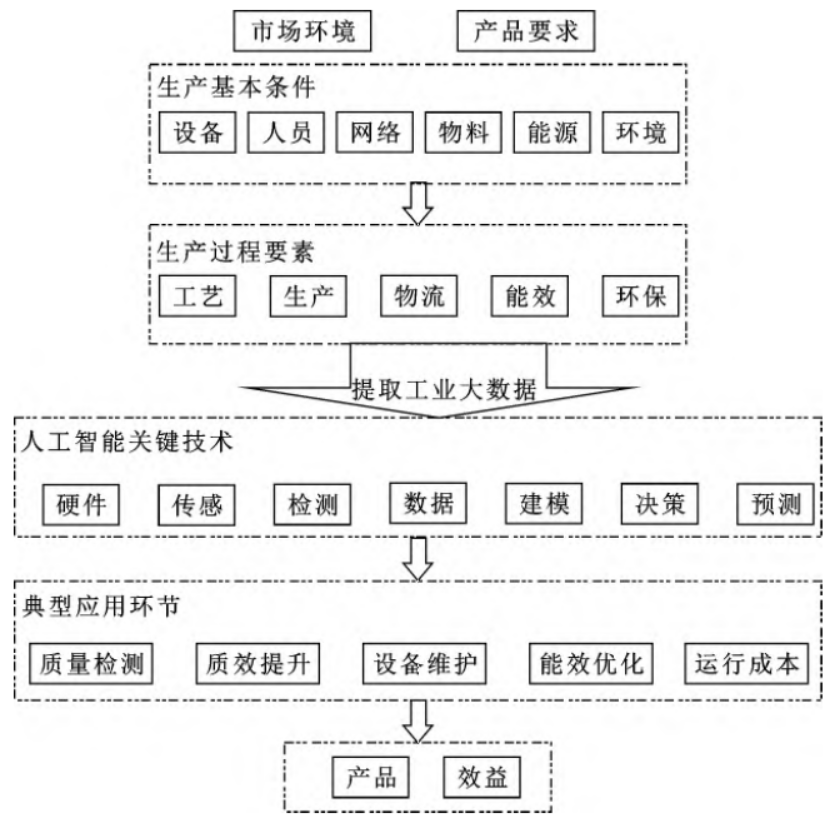 工业智能包含产品市场需求、物流、生产和产品销售等环节,其中涉及内容包括:在生产时具备的条件,包括人员配置与素质、设备情况、环境气候与温度湿度、各种实时匹配的物料以及动态能源消耗等;生产过程主要有几个关键环节,包括各种相关工艺、精细化的生产管理、工业互联网、物流计划调度、能效和环保的要求等;生产过程中提取的工业大数据,再应用人工智能技术对生产过程进行有效控制,其中的关键技术包括人工智能的硬件、建模、决策、预测、数据、传感和检测等,最后形成高效和高质量的产品,以产生良好的经济效益和社会效益。目前工业智能还没有形成市场和产品链的整体应用,只是在个别环节和技术上有些相关的成功探索,主要包括生产过程控制、设备故障诊断与健康预测、对象与质量检测、物料库存管理、生产效益分析等。