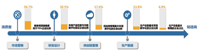 企业的数字化转型涉及从市场营销、产业研发、供应链管控到生产制造的各个业务环节。其中,靠近消费端的环节数字化转型基础好、起步早,数字化转型相对容易,销售预测准确度高于 70% 的企业比例达 38.7%;而靠近制造端的环节受核心技术能力不足、数字化基础薄弱等因素制约,设备基本实现数字化的企业比例仅为13.8%,生产设备基本联网的企业比例仅为 6.9%,生产制造环节数字化成为企业实现全链路数字化的关键掣肘。
