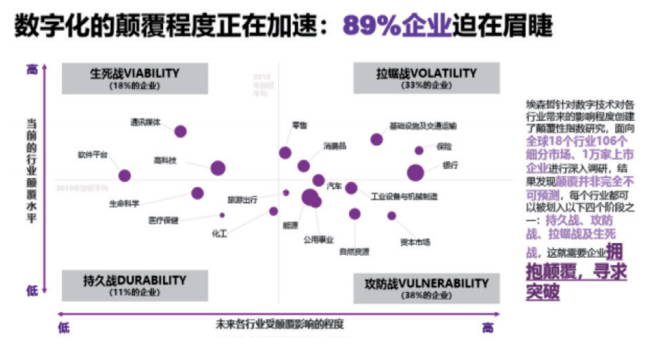 当然,这是一个漫长的过程,不同行业的数字化转型进程也不一样。埃森哲针对全球 18 个行业、106 个细分市场的 1 万家上市企业展开调研,发现 89% 的企业数字化的颠覆程度正在加速,数字化转型迫在眉睫,但不同的行业受数字化转型的影响也会有明显差异。