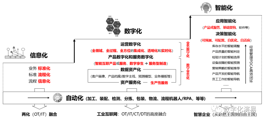如图1所示,信息化、数字化和智能化形成层层递进、不断深化的发展关系,而自动化则与之并行发展。说句题外话,自动化不是数字化,加工等领域的自动化替代不了运用管理的数字化。