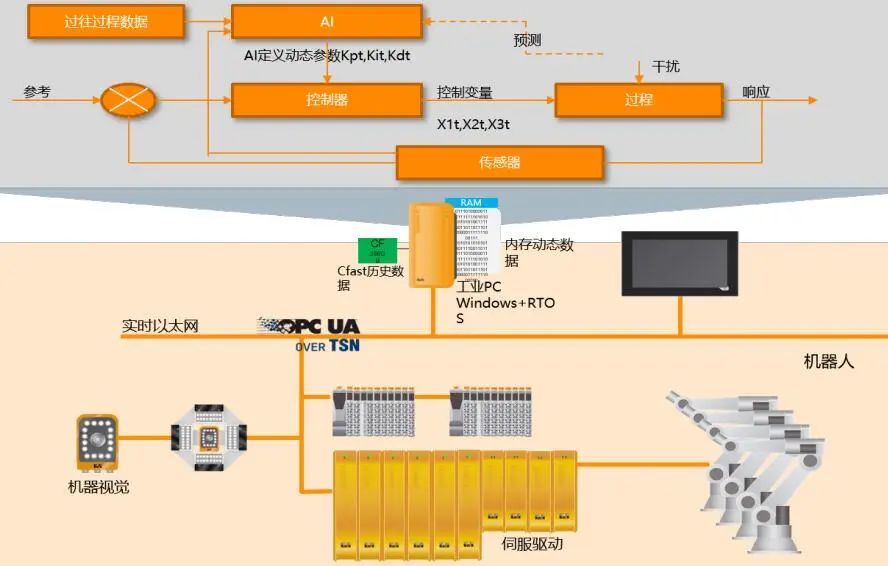算法可以对原有的P I D 过程进行监测,并寻求数据的最优,当然,可以采用静态或动态的数据监测,以及对历史数据的分析,获得优化后的模型用于进行推理运算。而推理结果可以直接给控制系统,进行I/O 逻辑、运动控制、工艺控制(温度、压力等),并且可以驱动机器人、输送系统来实现智能的执行。