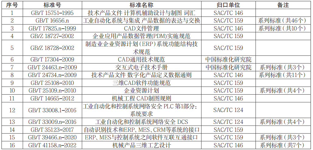 在国内,前期与工业软件相关的标准化组织主要有SAC/TC124 全国工业过程测量控制和自动化标准化技术委员会、SAC/TC 231 全国工业机械电气系统标准化技术委员会、SAC/TC 146 全国技术产品文件标准化技术委员会、SAC/TC 159 全国自动化系统与集成标准化技术委员会、SAC/TC 28/SC 7 全国信息技术标准化技术委员会软件与系统工程分技术委员会等,分别承担着工业过程测量控制和自动化、工业机械电气系统、工业软件技术产品文件、自动化系统与集成、软件与系统工程等领域标准化的工作,使得我国在工业软件相关的工业过程测量控制、技术产品文件、软件工程等关键技术领域已经具备了一定的标准化基础,已发布的专门针对工业软件的标准主要包括计算机辅助设计(CAD)、制造业企业资源计划(ERP)等工业软件相关产品标准以及网络安全、技术产品文件、数据格式等标准,具体如表1所示。
