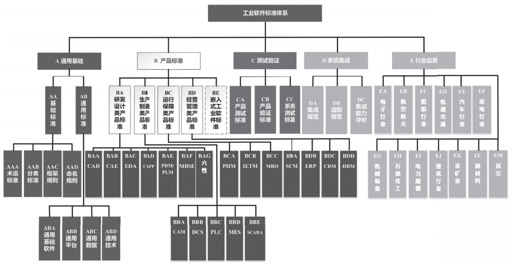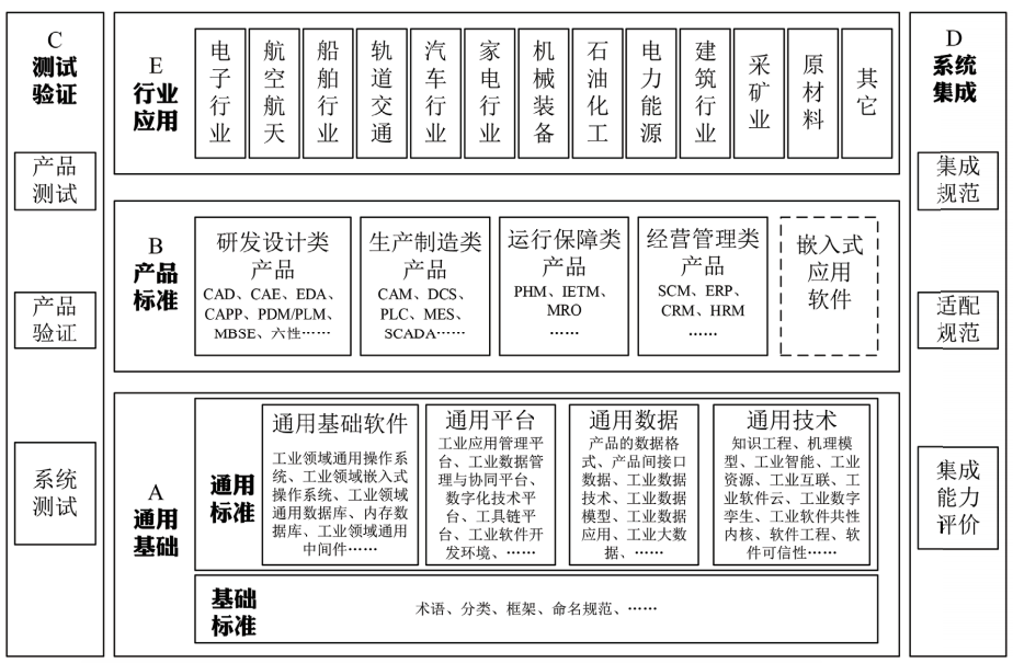 工业软件标准可包括“A通用基础”“B产品标准”“C测试验证”“D系统集成”及“E行业应用”5个部分,通用基础标准用于解决工业软件基础共性问题,产品标准作为标准体系核心部分与工业软件产品密切相关,测试验证标准主要用于工业软件产品、系统的测试、验证,系统集成标准主要针对工业软件产品的集成与适配,行业应用则从行业领域出发制定各行业个性化的工业软件标准。具体包括以下标准类型。