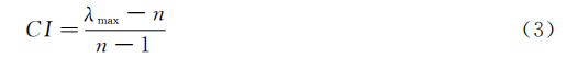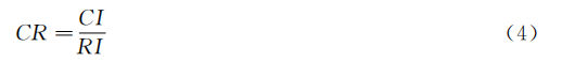 其中λmax为矩阵A的最大特征值。再利用公式(4)计算判断矩阵的随机一致性比率CR: