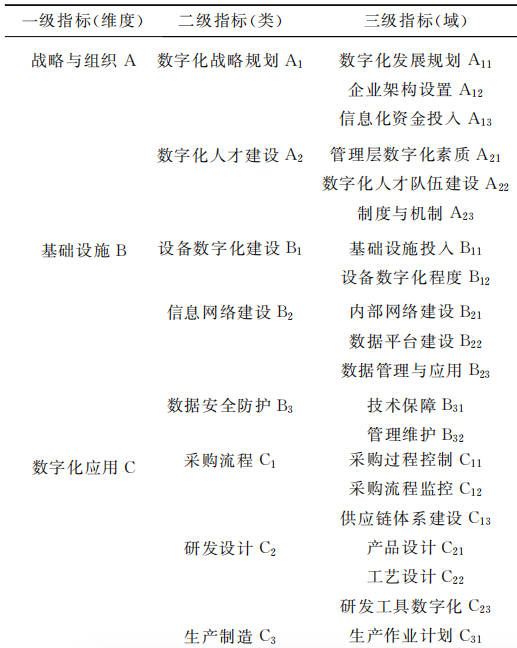在分析、汲取两化融合和数字化评价模型的基础上,结合当前中小制造企业数字转型现状,本研究以战略与组织、基础设施、数字化应用、效能与效益4个维度为核心,设立14个二级指标(类)36个三级指标(域)对中小制造企业数字化转型的评价模型构建进行探究,如表2所示。