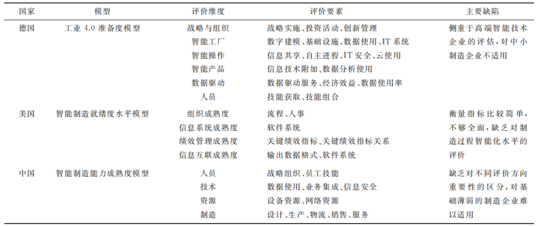 美国国家标准研究所(NIST)提出的智能制造就绪度水平模型(SMSRL)主要从组织成熟度,信息技术成熟度,绩效管理成熟度和信息连接成熟度等4个维度评估制造公司是否采用数据密集型技术进行性能管理的准备情况。工业和信息化部在2020年发布的《国家智能制造能力成熟度模型》提出,从人员、技术、资源和制造4个能力要素在企业进行管理提升和综合应用的程度,客观评价各地区、各行业智能制造发展水平,为企业精准提升智能制造能力,起到重要的参考价值。成熟度评价模型对比如表1所示。