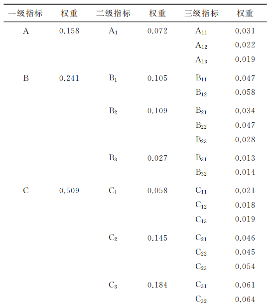 由于判断矩阵中评估专家主观判断会产生一定的偏差,所以需要检验一致性。首先利用公式(3)对判断矩阵的一致性指标进行计算: