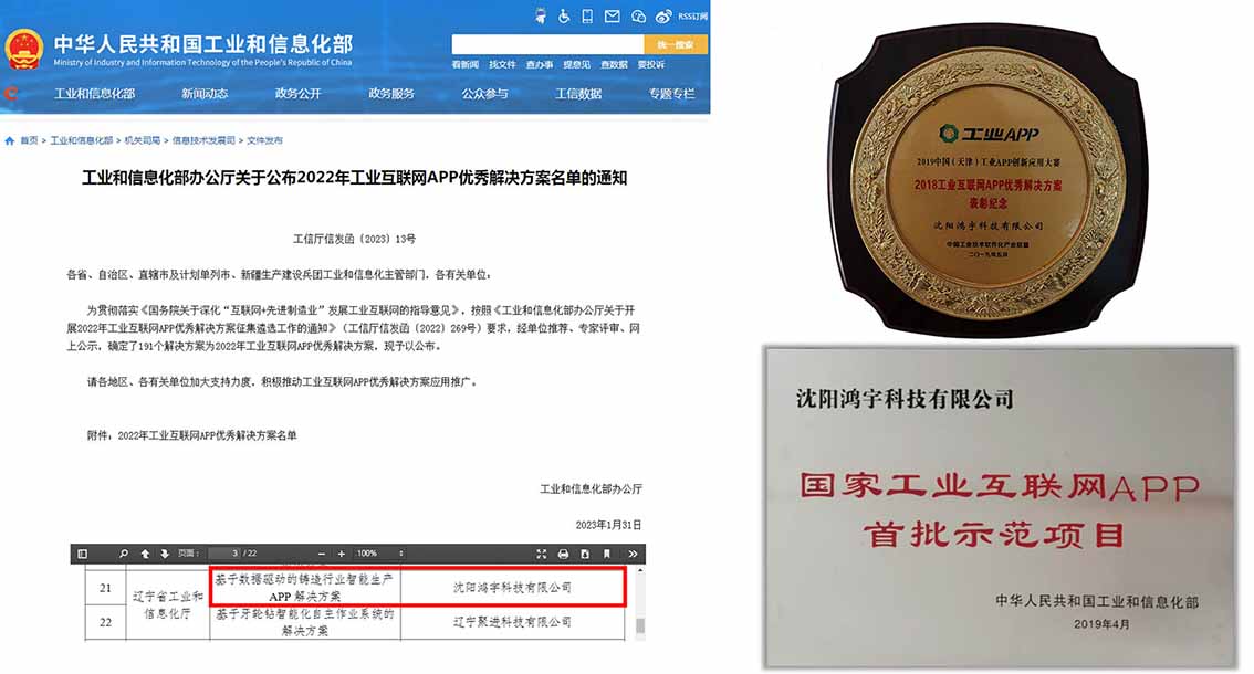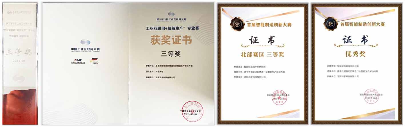 鸿宇科技曾多次荣获国家级优秀项目认证、优秀企业以及优秀供应商称号:铸造行业解决方案荣获中国工业互联网大赛专业赛三等奖、首届智能制造创新大赛北部赛区三等奖及全国优秀奖,继“鸿宇智能工厂管家APP综合解决方案”2018年度首次入选之后,又以惟一面向铸造领域的工业APP解决方案再获国家工信部认可;耐火材料行业解决方案荣获第十一届创新创业大赛辽宁赛区一等奖;参编的国家标准《智能制造系统架构》、《汽车智能制造能力成熟度评估要求》均已正式发布。
