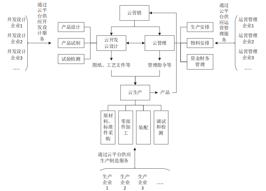 云制造以需求为核心,将需求分析、设计开发、生产、管理、营销等环节云端化,打破现有产品由单一企业制造的模式,实现产品与需求直接对接。将制造体系通过云平台分解到各类企业中,制造企业、设计开发企业、管理运营企业提供专业化、标准化、系列化、组合化的设计、制造和管理服务,形成制造基础能力,由云端整合制造资源,调用组合制造基础能力,输出满足需求的产品或服务,最终满足需求。云制造模式将设计开发服务、生产制造服务、运营管理服务作为供应链体系中的重要输出,逐步将制造体系融入供应链体系,拉近制造与需求的距离。