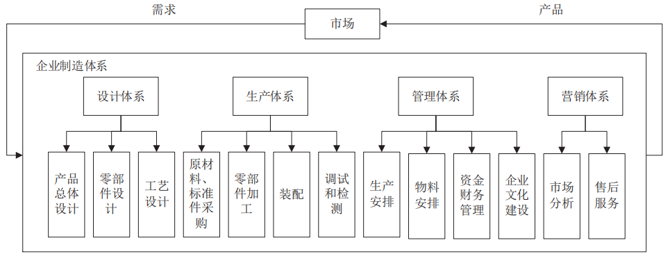 传统制造体系以满足市场需求为目标,组织开展生产活动,并提供市场需要的产品,体系结构如图3所示。传统制造体系是以某个企业或企业集团为主体组织生产,要求企业具有相对完整的组织结构和独立生产某种产品的能力。