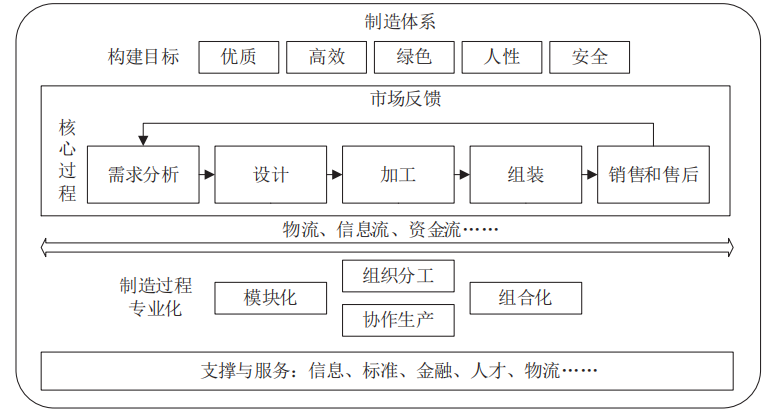 制造体系将与供应链体系深度融合,供应链支撑制造体系运转,同时广义的制造体系维持供应链的形成和稳定。制造体系要达到“优质、高效、绿色、人性、安全”的目标,就需要以信息化为基础,将整个制造体系中的各要素协调优化,实现制造体系的系统化、一体化、智慧化。制造体系组成及内部关系如图1所示。