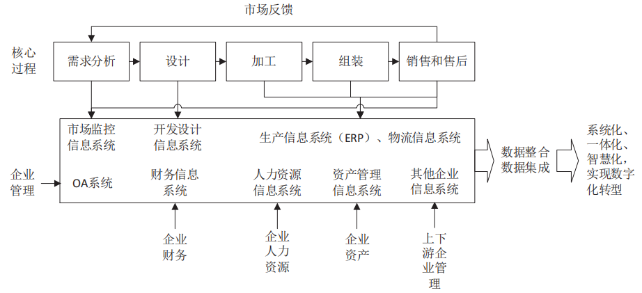 制造体系数字化转型的基本原理:(1)将制造体系的各个环节、各个要素信息化、数字化。(2)通过系统理论、信息技术、网络技术、智能技术等实现数据整合、集成。(3)制造体系的整体最优化,实现数字化转型升级,基本原理如图2所示。