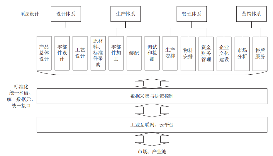 制造体系是以产品的生产为核心,包括需求分析、设计、生产、销售和售后等关键环节。随着社会分工的不断深化,以标准化为基础,制造体系不断朝着专业化、社会化方向发展,生产效率极大提高。制造过程中伴随大量的信息,如市场需求信息、设计研发信息、生产制造信息、市场反馈信息等,信息以数据形式在制造过程中流动,形成“信息流”,与“物流”“资金流”等一同支撑制造过程的运转。