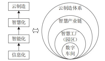 制造体系数字化转型路径:(1)数字车间建设:工厂的基本信息化、数字化改造。(2)智慧工厂(园区)建设:厂区(园 区)内信息化升级。(3)智慧产业链建设:产业链的智慧化升级。(4)制造模式改革:实现云营销、云设计开发、云管理、云制造。制造体系数字化转型的过程与路径如图6所示。