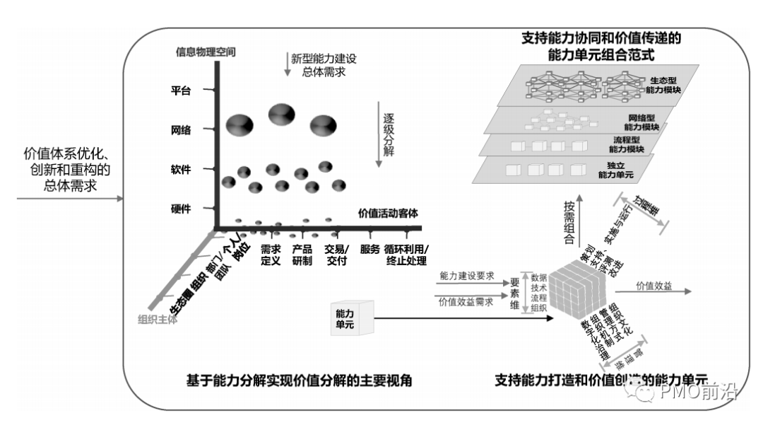 基于能力单元的价值创造和传递体系是指从组织主体、价值活动客体、信息物理空间等三个视角出发 ,通过新型能力的分解实现价值效益目标的分解,进一步明确能力单元建设要求,通过能力单元以及基于能力单元组合形成的能力模块建设,实现能力打造和协同,由此构建覆盖全组织的基于能力单元的 新型能力体系,支持价值创造和传递,如图所示。