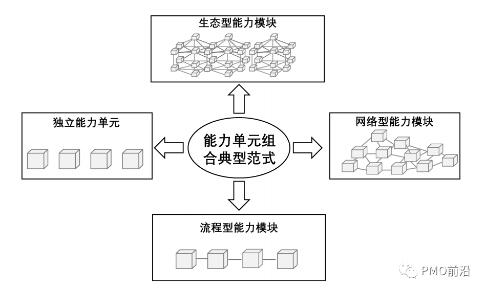 d) 生态型能力模块,即基于可实现认知协同的价值流,由组织内外部能力单元之间生态化连接组成的能力单元组合,主要承载组织及其合作伙伴所在生态圈的能力生态。
