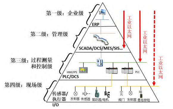 为了更方便地实现OT与IT网络的互通,以及实现全流程的数据流转与智能化生产,IP化与无线化已成为智能工厂内网络技术发展的趋势。通过IP技术可以实现从现场级、过程测量与控制级、管理级、企业级网络技术的统一,完成“e网到底”的技术目标 (如图1所示)。