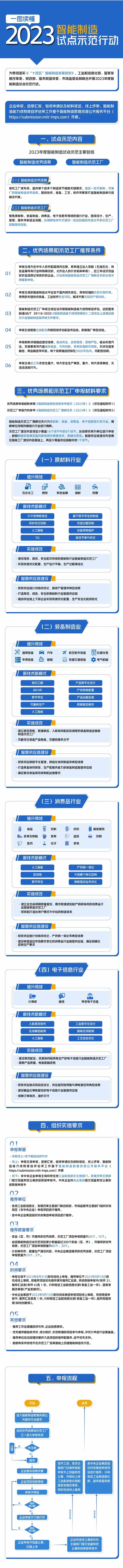 工业和信息化部、国家发展改革委、财政部、国务院国资委、市场监管总局近日联合印发通知,组织开展2023年度智能制造试点示范行动。将遴选一批智能制造优秀场景,以揭榜挂帅方式建设一批智能制造示范工厂和智慧供应链,在各行业、各领域选树一批排头兵企业,推进智能制造高质量发展。
