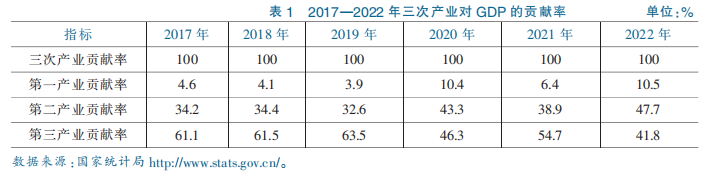 2.支柱产业作用日益凸显。从近年来三次产业对 GDP 的贡献率来看,表 1 显示,2017—2022 年第二产业对 GDP 的贡献率由 34.2%上升为 2022 年的 47.7%。尤其是 2020 年新冠疫情暴发后,受疫情影响,人们减少出行和与之相应的消费,使第三产业对 GDP 的贡献大幅减少,此时,制造业韧性较强、回旋空间大、抗风险能力强的特性得到体现,有效助力了复工复产,为我国经济保持正增长作出了重要贡献。因此,当前制造业仍然是拉动经济增长的强劲动力,仍应以制造业转型升级作为重要战略基点,坚持创新发展,提高对外开放水平,助力构建新发展格局。