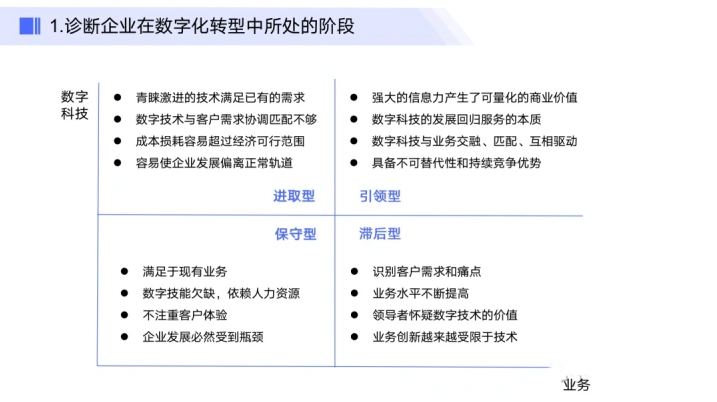 根据数字科技的应用程度和业务转型的进展情况,我们以数字科技的应用为纵坐标、业务为横坐标,可以将企业分为引领型、进取型、保守型、滞后型,按照数字化转型的广度和深度,将企业数字化转型对应三个阶段。