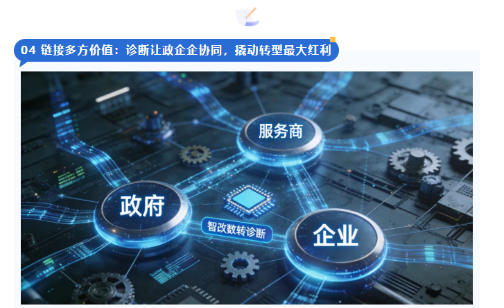 制造业的智改数转,从来不是企业的“单打独斗”,而是政府、服务商、企业三方协同的系统工程,而智改数转诊断,正是打通三方协同的核心纽带,让企业能最大化撬动转型的多方红利。