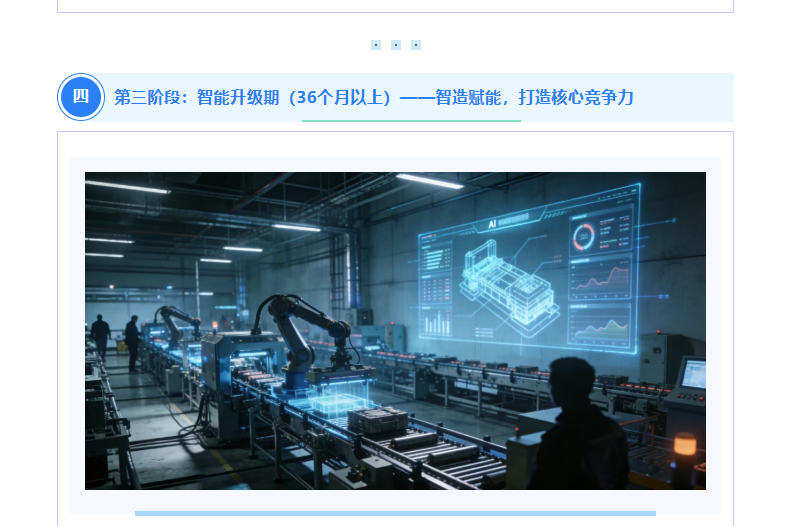 ·梯次推进,不搞全域铺开:遵循“单点突破—局部集成—全域智能”的路径,先试点核心产线或关键工序,验证成效后再全面推广,降低转型风险。